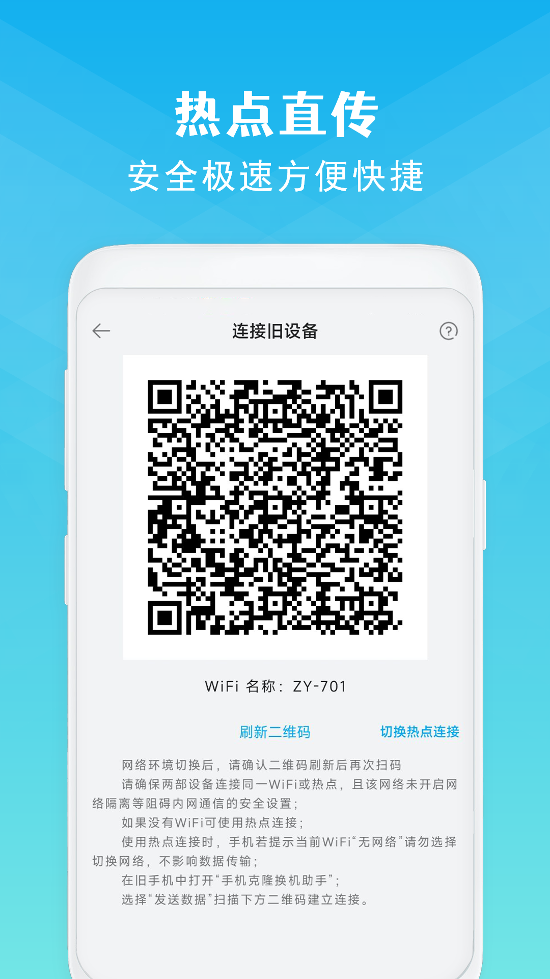 3. 在新手机上扫描旧手机上的二维码,建立连接。
