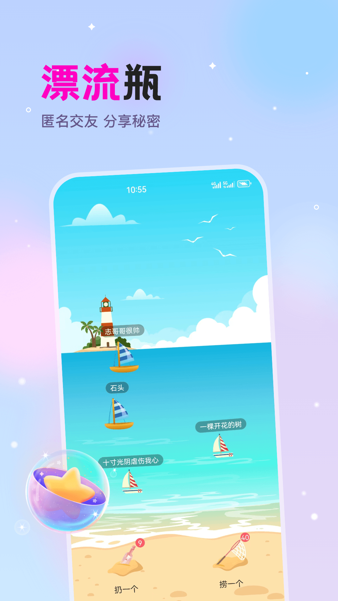 漂流瓶文聊(com.bottle.chatbottle)是一款社交交友类脱单软件,软件中你可以认识超多漂亮的小姐姐和帅气的小哥哥等你来认识,最原始的漂流瓶玩法以及各种不同脱单内容等你来获取吧,在这里你可以认识超多不同的社交模式和大量的脱单小游戏等你来参与体验哦,有需要扩大社交圈的朋友千万不要错过了!