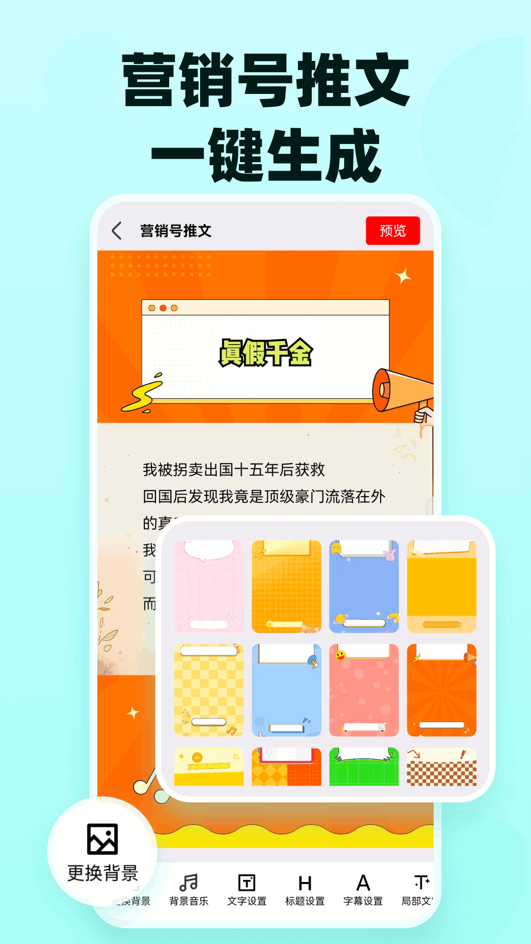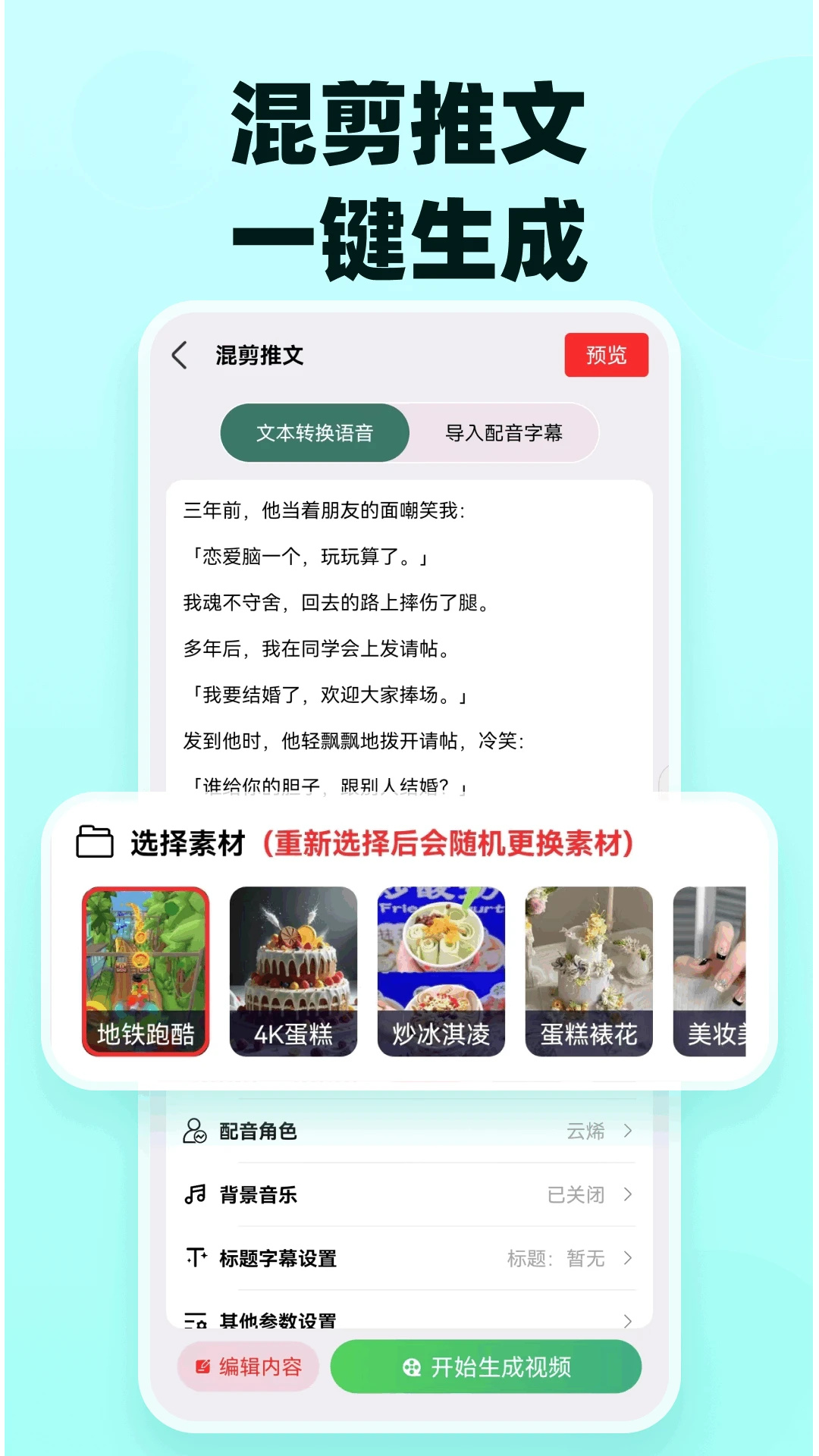 3、推文达人用手机就能把你的文字内容秒变爆款视频,让您一键成片。
