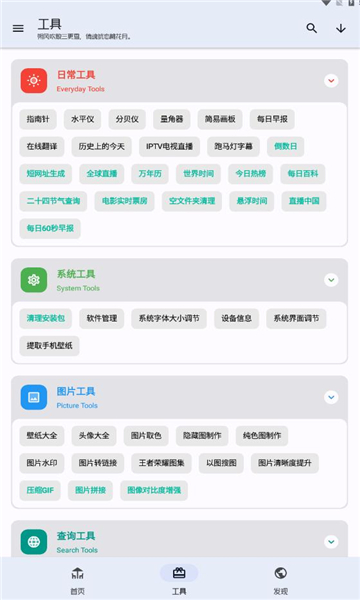 3.打开【工具】页面,有日常工具、系统工具、图片工具、查询工具、提取工具等