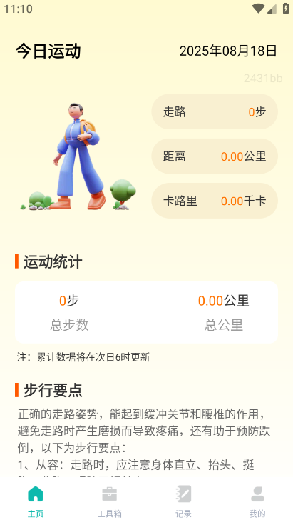 3、开始记录:在软件界面上,轻触“开始记录”按钮,即可开始记录运动步数。行云健步计步会自动记录你每天的步数,并显示在界面上。