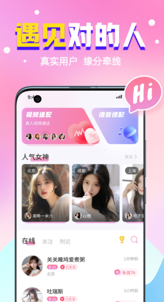 一个速配社交软件。系统根据你的性格、爱好为你匹配有缘人,聊天回复及时,奔现脱单容易,遇见对的人其实也很简单,同城交友就来想想,轻松搭讪,在线交友,认识更多有趣对象,随时随地在线聊天,认识更多志趣相投的人,分享精彩生活,开心畅聊,视频聊天交友更尽兴!