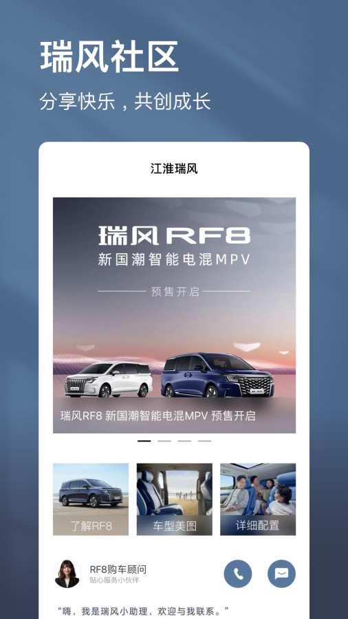 以智能车机为本,围绕用户可感、可知、可用、可享的智能技术,为用户提供线上购车、售后服务、远程车控、车辆精品附件以及生活周边信息等一站式服务。用户可以全面了解江淮汽车资讯,车主真实的用车体验,可以了解和报名参与江淮瑞风发布的多样化活动,获得高质量信息,创造更愉悦的生活方式!