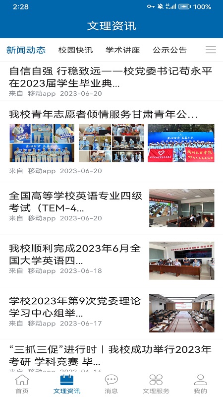 i文理app是一款专门为兰州文理学院打造的校园服务软件,这里也是带来了更加全面的服务内容,用户朋友可以在平台随意浏览相关校园资讯,也是能够提供到优质的办公体验,有需要的朋友现在就来下载吧!
