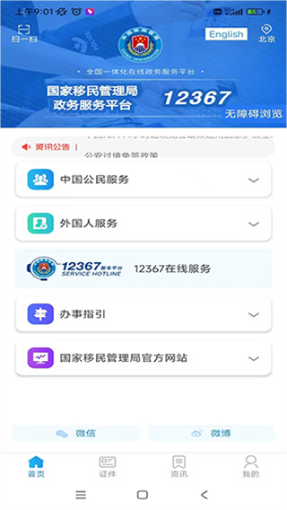 3、来到软件在主页可使用中国公民服务、外国人服务、在线服务、办事引导等功能。