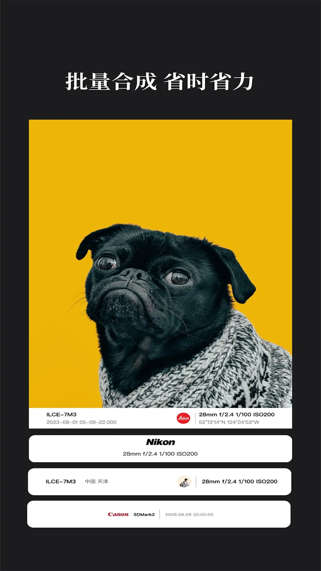 边框水印大师app是一款非常好用的边框水印添加软件,该软件拥有简洁的用户界面给可以让用户们快速上手完成照片的边框和水印的处理,并且无需专业的图像编辑技能,即可实现精美的效果。同时这款软件提供了市面上所有品牌的水印以及能够自动识别图片信息批量添加水印,从此让加水印的步骤变得轻松高效!