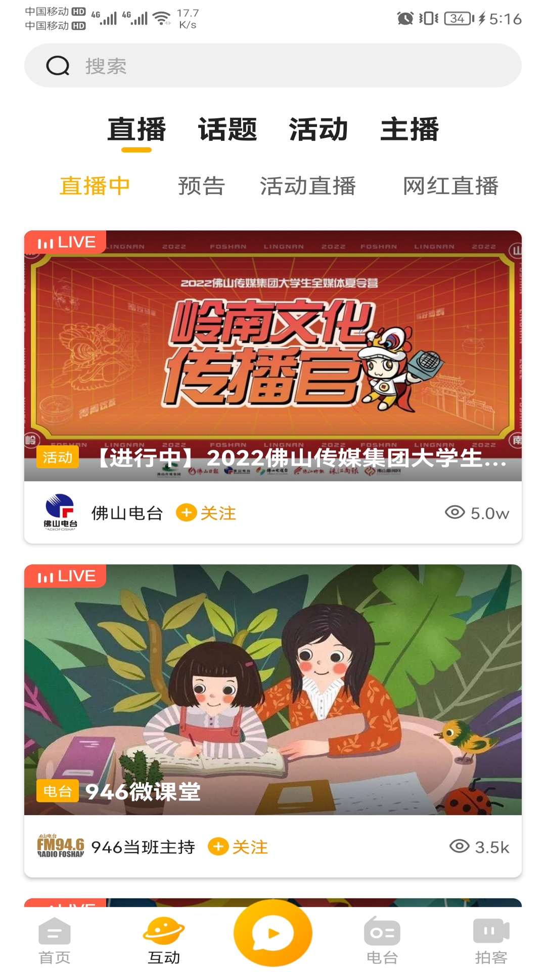 2、互动栏目提供直播、话题、活动、主播四大不同的版块;