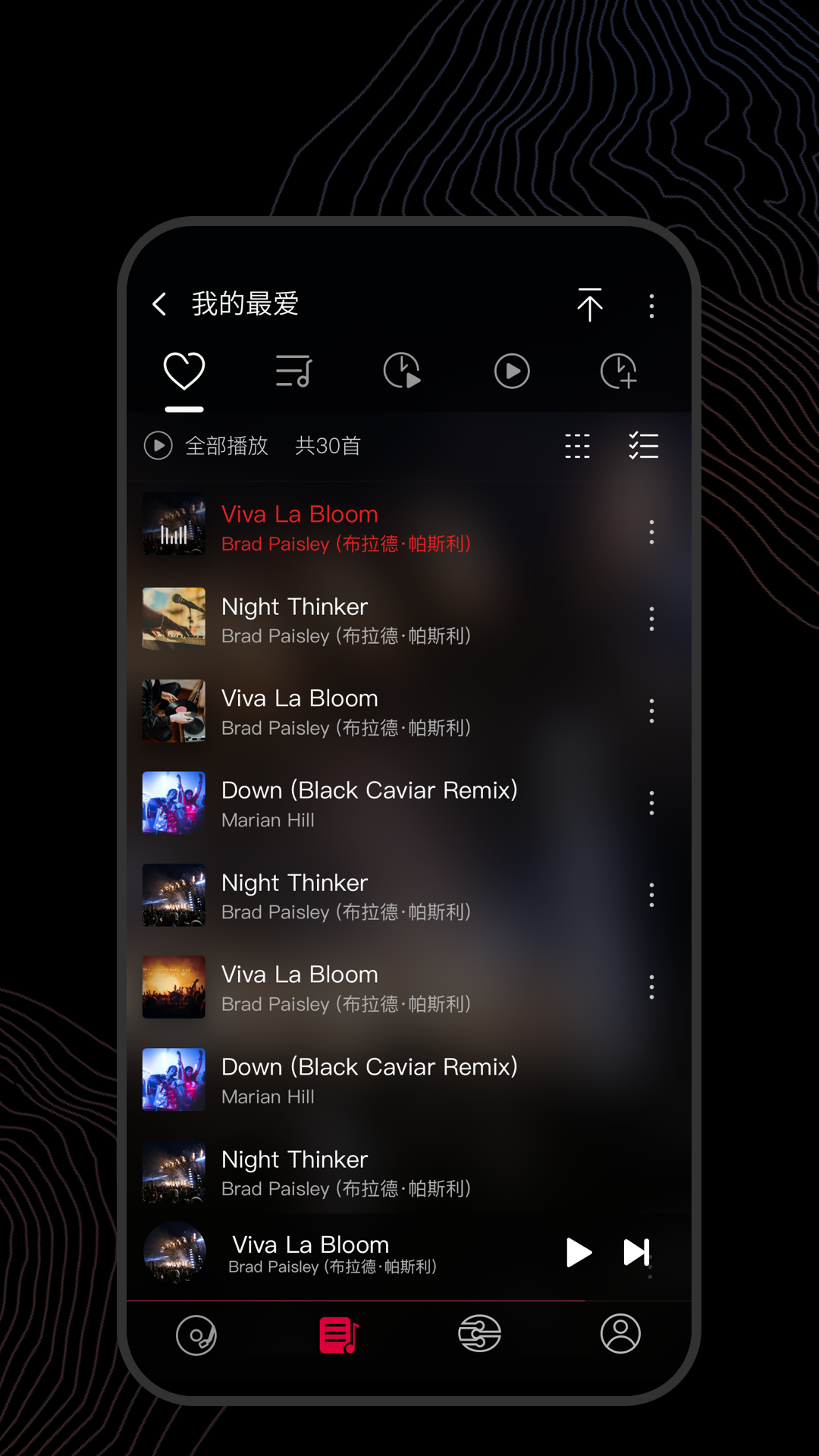 2、在底部“列表”图标栏目中,可以通过最爱、最近播放、最多播放来找寻你的音乐。