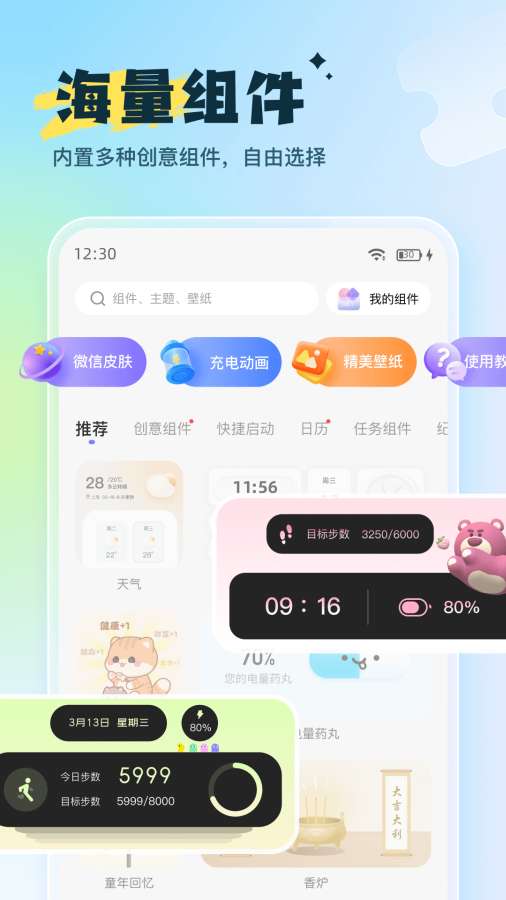 1、包含数千种不同风格和功能的小组件,覆盖生活、工作、娱乐各个方面,满足用户的个性化需求。