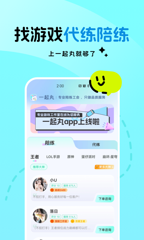 一起丸陪练app在这里广大用户都是可以来轻松预约陪玩的,大家都是可以来享受到超多的乐趣,覆盖了多个热门游戏,从此都是可以来享受到超多的精彩,还有超多的陪玩大神在线,能够为玩家提供专业的游戏指导和技术支持,超多不同的陪陪等你来认识哦!