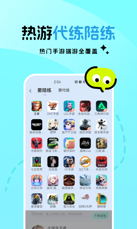 1、安装好软件就能点击进入,能够找到各种各样游戏陪练。