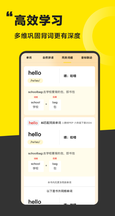 K12全覆盖:内置人教版、外研版、沪教版、译林版等主流教材词汇,同步小学至高中各阶段课标要求,适配学校教学进度。