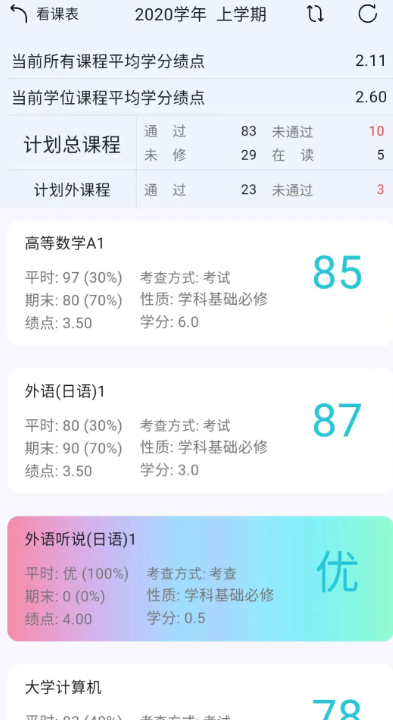 多维度查询:支持单科成绩、总评成绩、学分绩点一键查询,生成可视化成绩趋势图。