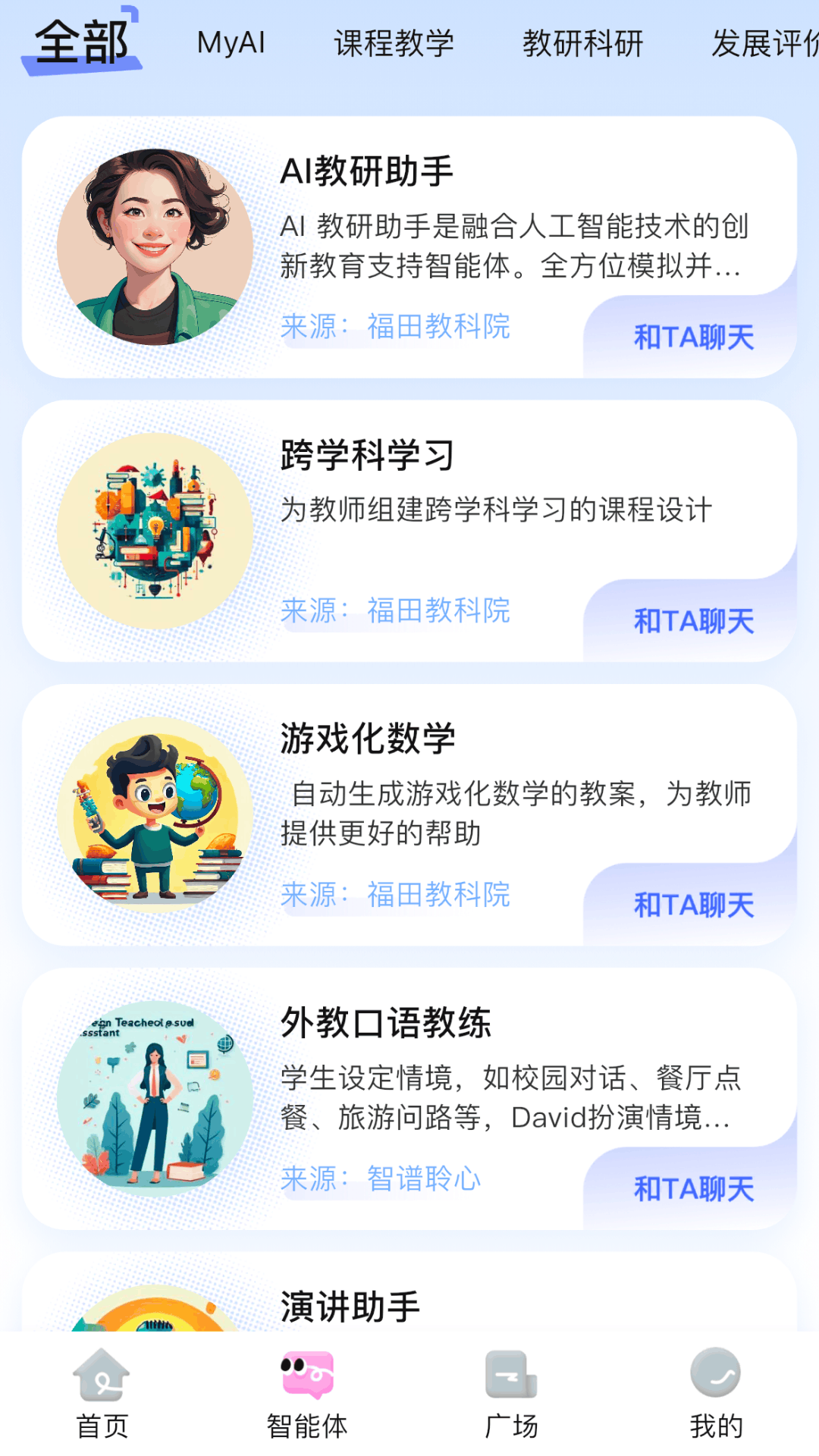 4、智能体选择与应用:根据教育教学需求,教师可自行选择对应的智能体,以便高效对话和获取方案。平台已上线30多个教育智能体,涵盖课程教学、学生发展、教育科研等多个领域。