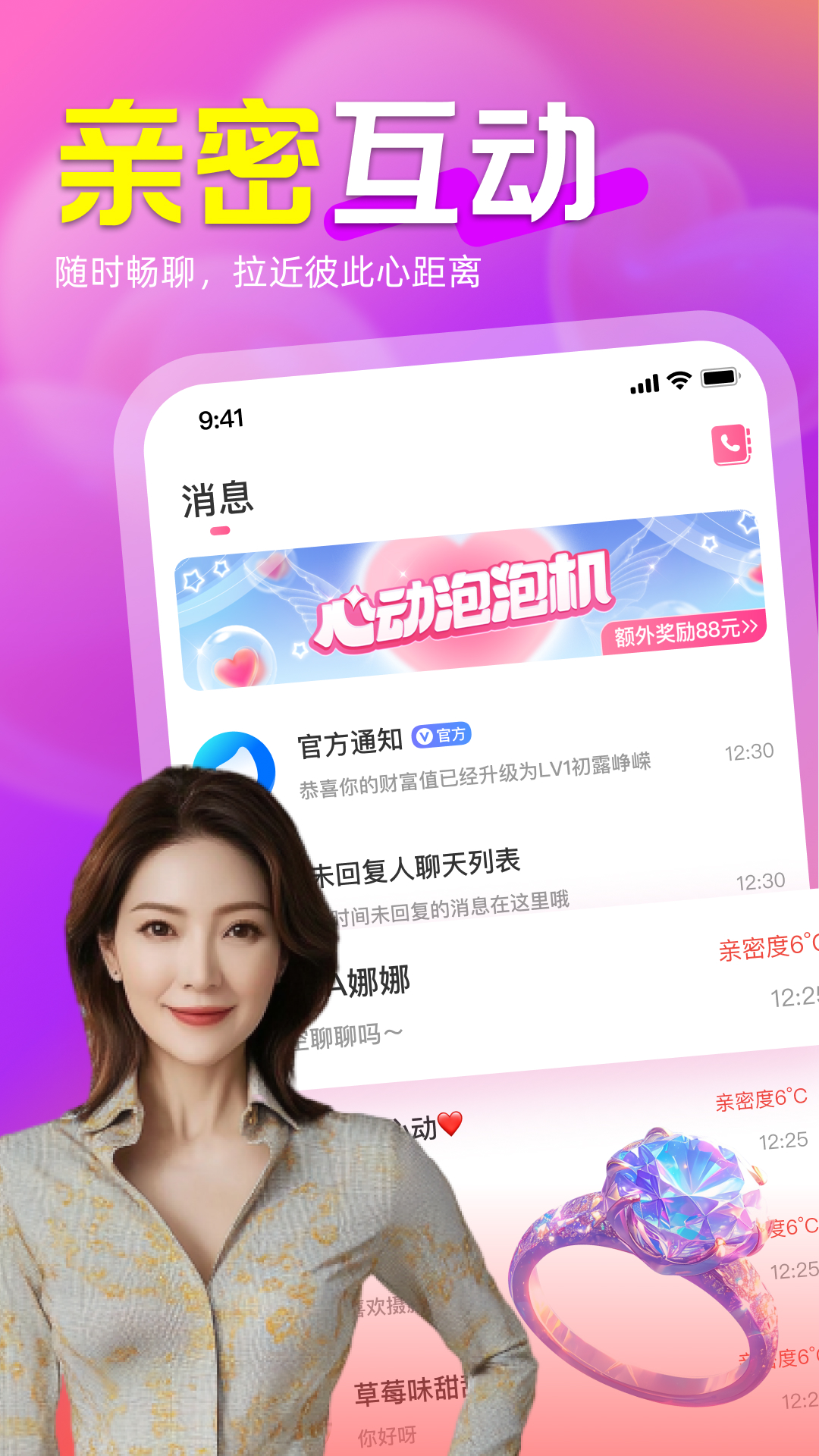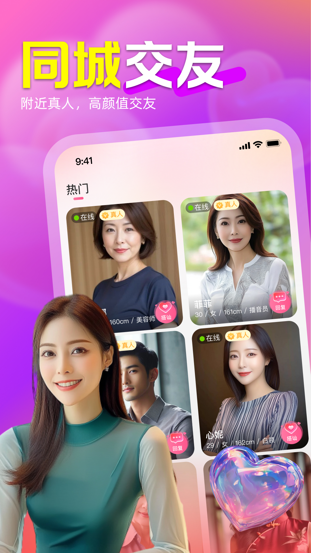 附近聊友是一款功能完善的社交聊天软件,为当下年轻人提供一个交友的平台,真人实名认证保证用户的安全,点击爱心走出第一步,还有大量线下活动分享你的生活,多种交友模式提高交友效率,分享你的真实情况,选择适合你的另一半,软天反诈、限时真实照和 90 秒语音盲聊做成了"三板斧",再也不用担心线上被骗,为广大用户真诚的交友提供平台。