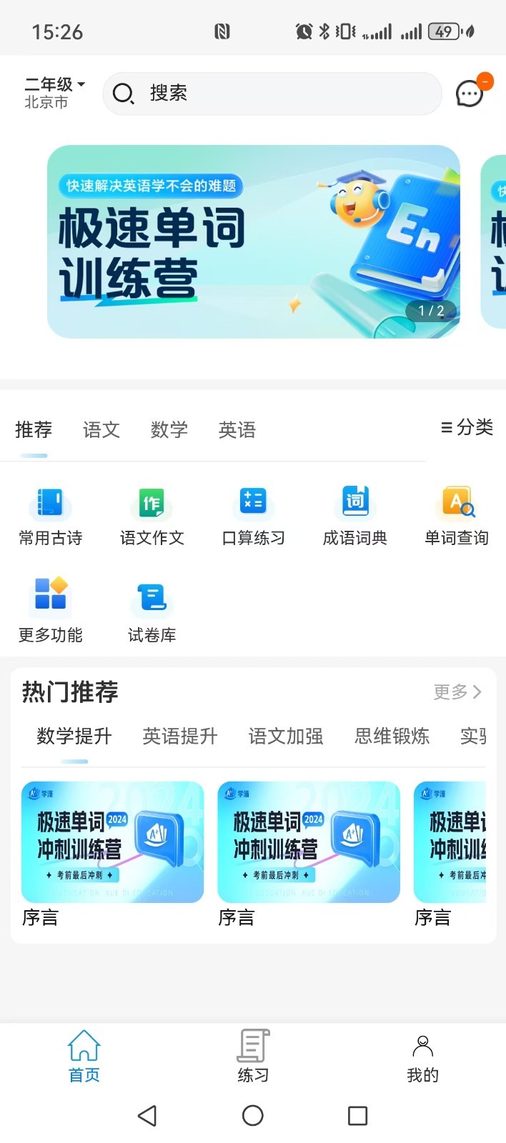 2、首页提供了多样的学习内容,有语文、数学、英语可以让你自由选择。