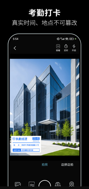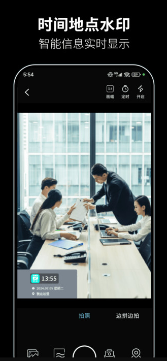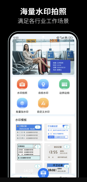 3、用户打开相机功能时,可提前选择水印类型或模板,拍摄照片的同时自动添加水印。