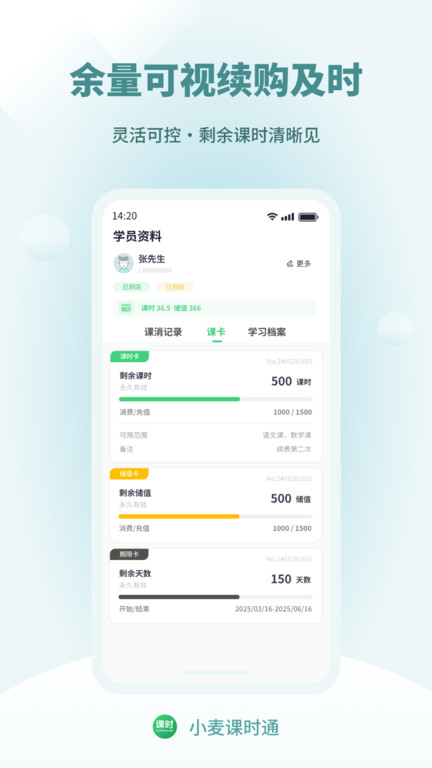 1、通过学员全景档案功能,将学员的各类信息整合为一个完整档案,包含联系方式、报名课程、剩余课时、学习进度、上课考勤和家长信息等。