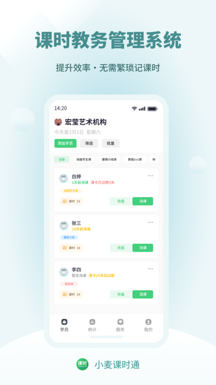小麦课时通app是一款专为教育机构打造的课时管理平台,能够优化教务管理和学员信息管理,提高院校、培训机构和教师的工作效率。通过全面的功能设计,为教育管理提供了新的解决方案,从学员的全景档案到灵活的班级管理,整个管理流程变得更加智能、高效。支持生成详细的财务报表,帮助教育机构掌握学员的缴费状态和课程收入。