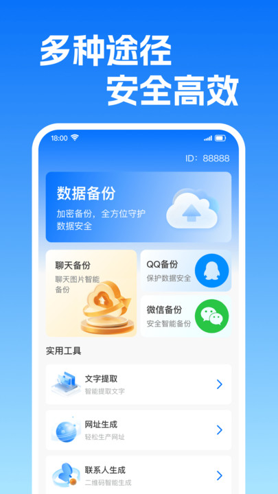 2、进入首页可以看到丰富的功能,可以高效进行微信QQ备份。