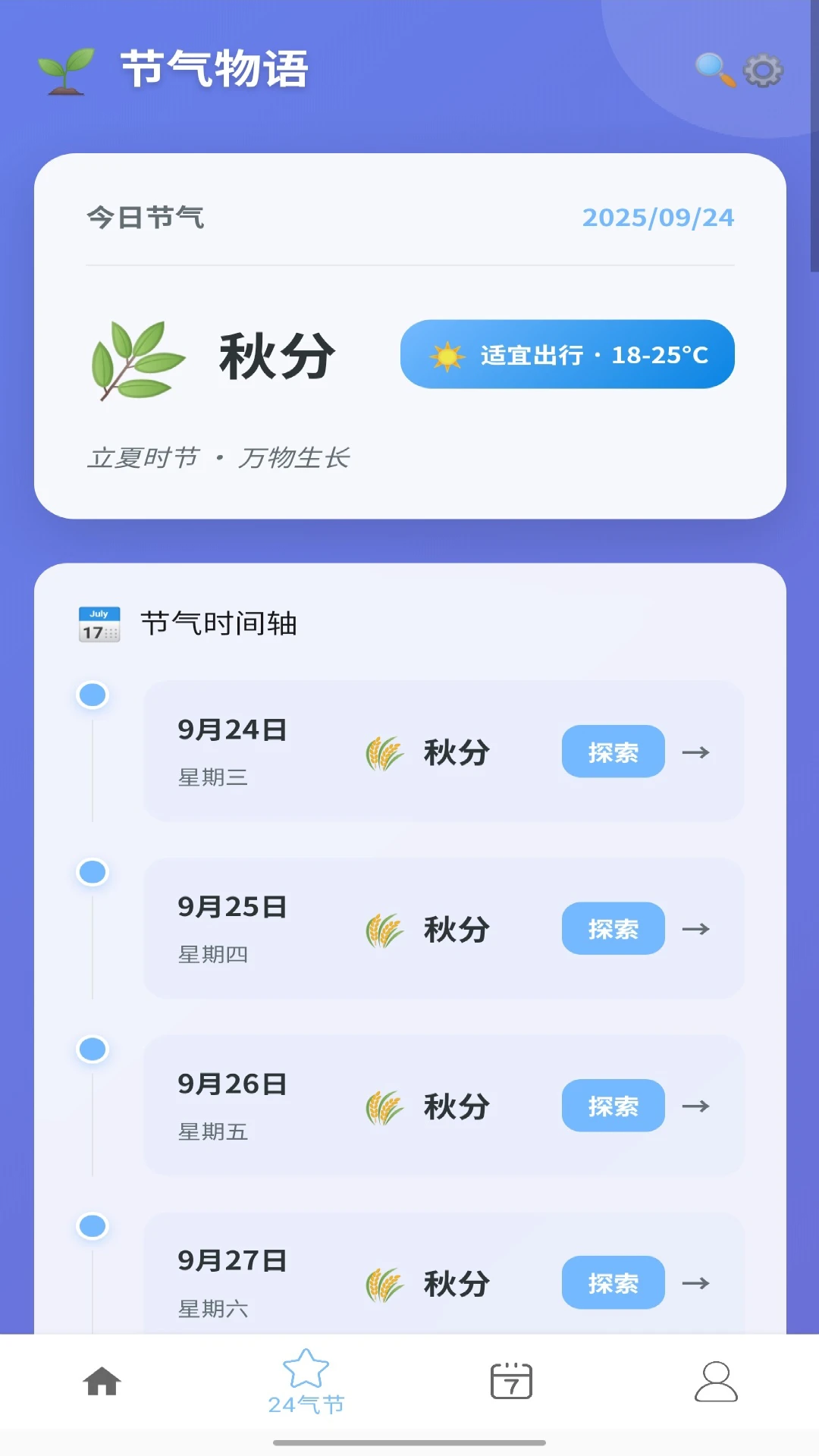 3、探索节气,深入理解,通过节气专区,了解每个节气的由来、习俗与相关活动建议,感受传统文化的魅力。