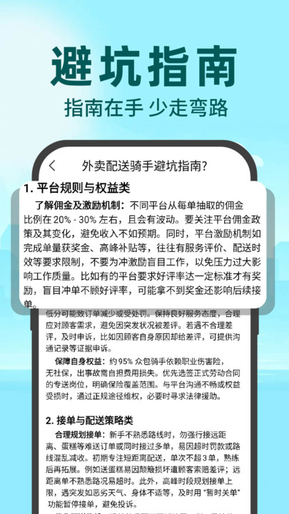 2、平台为新骑手准备了全面的入门指南,包含接单技巧、服务规范、异常情况处理等实用内容,同时详细说明平台规则和权益保障措施。