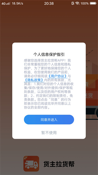 1、在手机上轻松下载安装货主拉货帮app,阅读个人信息保护指引,点击同意一键开启您的智慧接单。让货源信息离你更近。