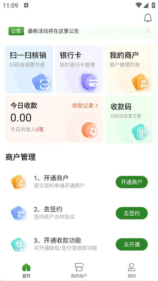 3、首页直观展示综合支付码牌集成支付宝与微信、经营数据概览、账户余额查询等核心功能,操作便捷,一目了然。