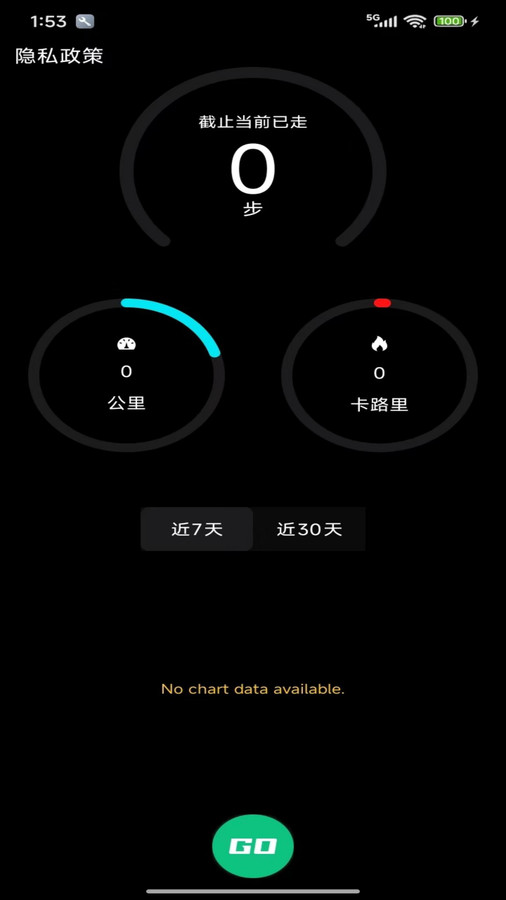 3、进入首页,可以看到近7天以及近30天的走路步数以及公里数、消耗的卡路里数,点击GO就可以开始运动。