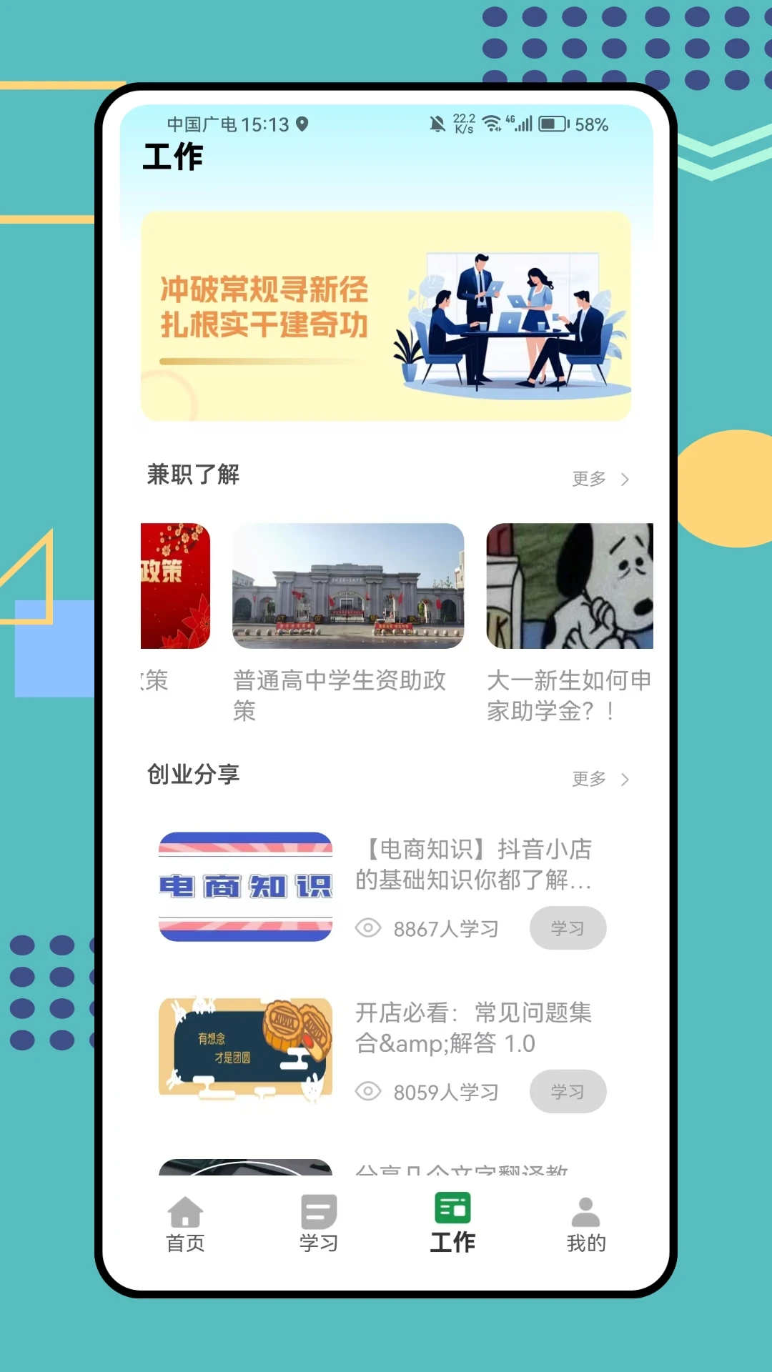 3、在下方工具栏点击工作,可以轻松了解更多兼职工作和创业的相关资讯。