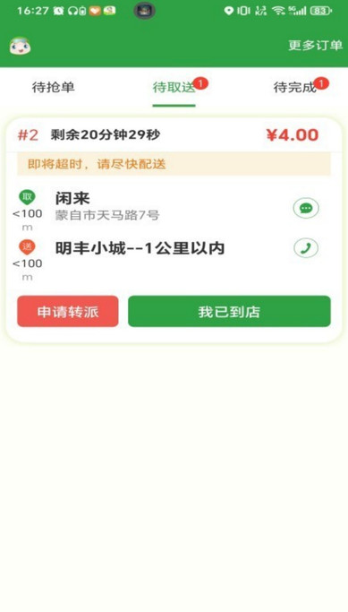 2、骑手点击订单即可看到配送目的地、配送时间要求及配送佣金金额。