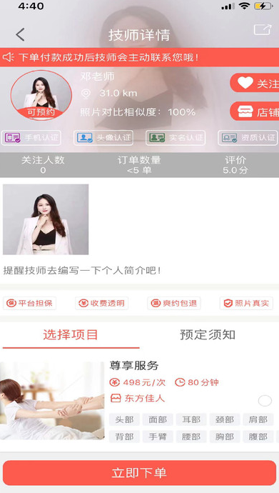 1、服务结束后,可在线支付费用,并对技师服务进行评价,反馈内容会纳入技师评价体系。