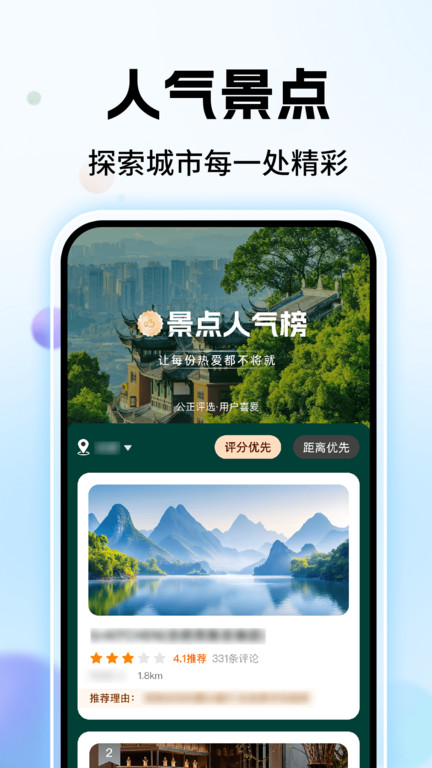 3、点击景点栏目,这里有景点人气榜,你可以选择评分优先,也可以选择距离优先。