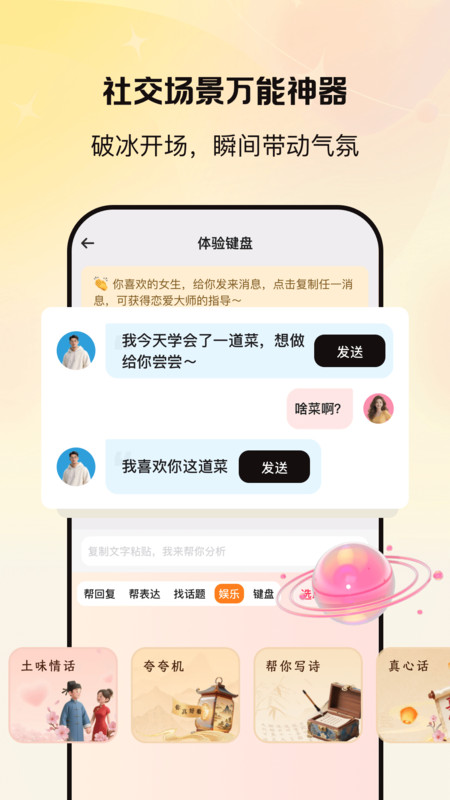 3、这款手机键盘工具内置丰富多样的幽默话术库,用户只需轻轻一点,就能轻松调用。