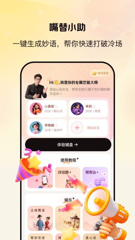 嘴替小助app绝对是你在社交过程中必备的好帮手,拥有强大的键盘功能,可以根据你的聊天内容来推荐最佳的回复话术,根本不需要为回复什么而担心,平台还会实时的分享一些聊天的场景,让你可以在各种的场合中去学会聊天,让聊天从此不再尴尬,想要学习的小伙伴一定不要错过了!