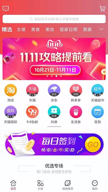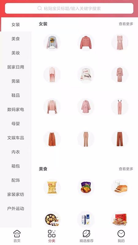 4、来到软件分类页面可查看女装、美食、美妆、居家日用、男装等精品分类。