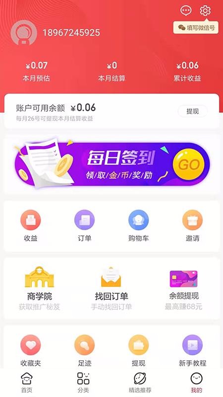 3、来到软件我的页面可查看收益、订单、购物车、邀请、找回订单等功能。