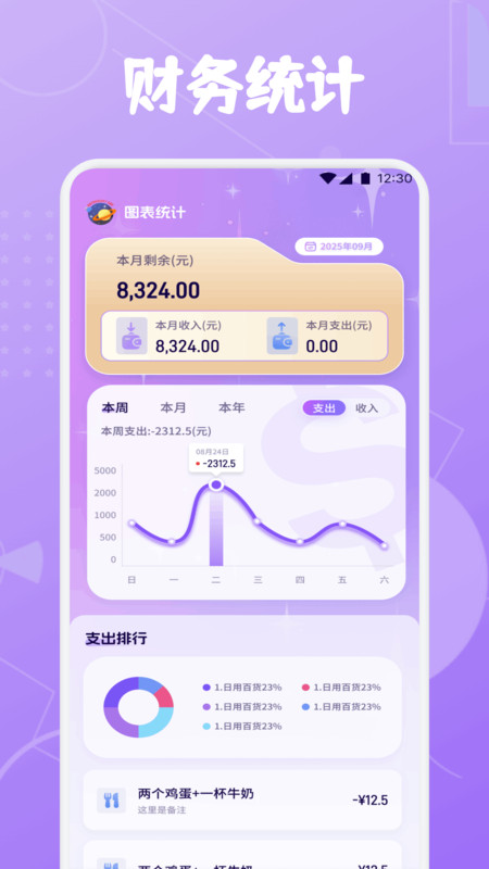 2、数据可视化模块将收支数据转化为直观的饼状图、柱状图和趋势曲线,用户可通过旋转三维饼图查看不同角度的消费占比。