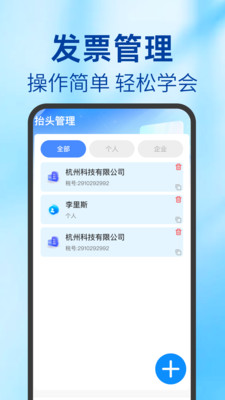 3、可管理多个发票抬头,企业、个人抬头信息一键保存,开具新发票时直接选择,不用反复输入抬头详情。