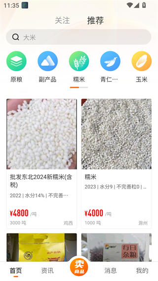 4、在首页上方有各个类型粮食的入口,下方还有最新的一些报价。