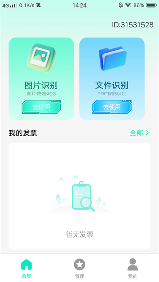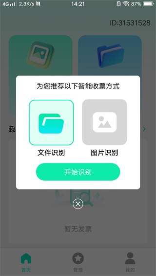 3、自由选择去使用图片识别或者文件识别的功能,还能进行我的发票全面管理服务。