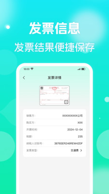 3、通过智能识别功能,app自动提取发票上的关键信息,如发票号码、金额、日期等,并自动归类,让发票记录一目了然。