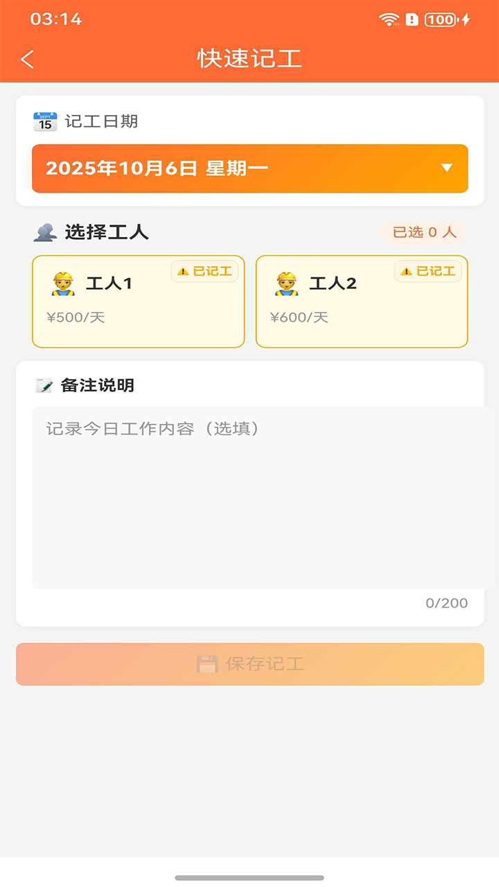 2、智能记工模块支持按日期快速标注工作内容,并添加个性化备注说明具体工作情况。