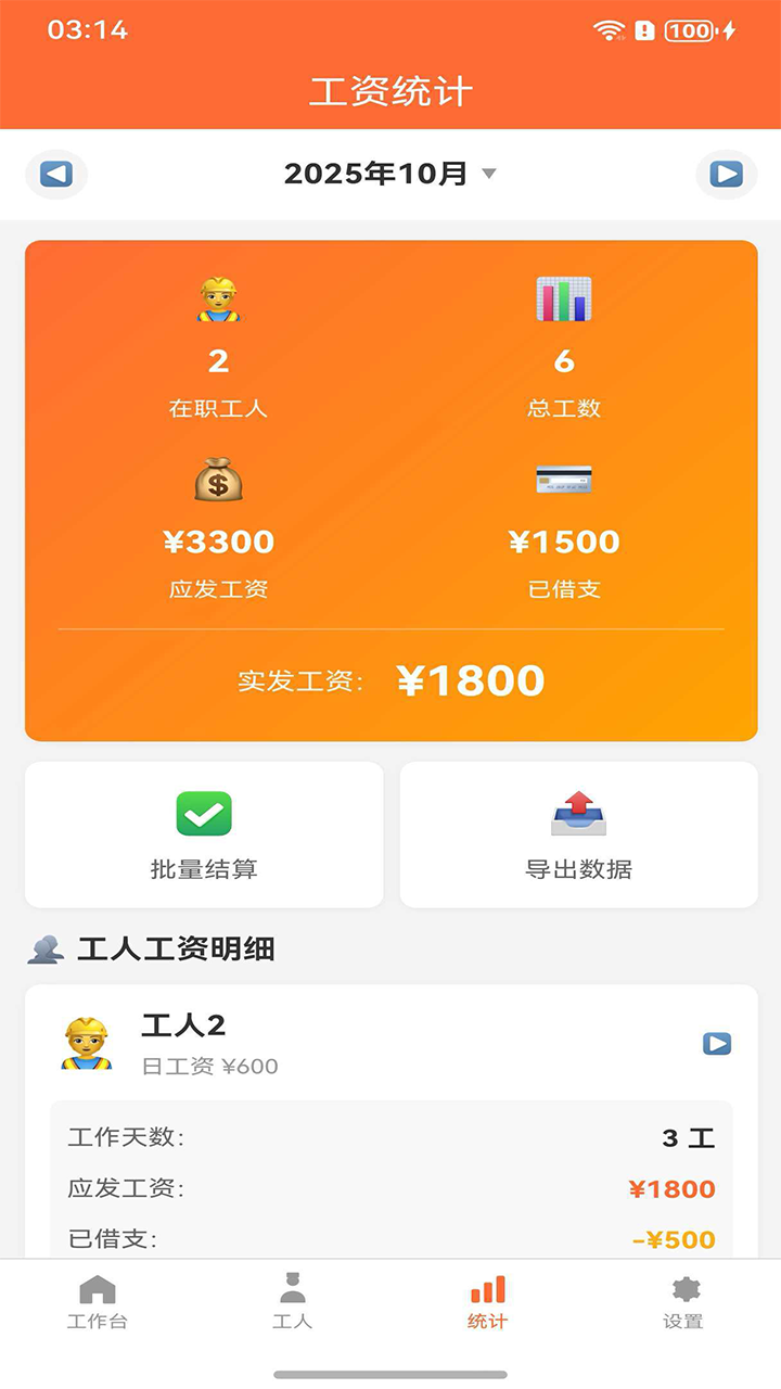 3、工资统计系统自动汇总周期内工时数据,精准计算应发金额与已支取款项明细。