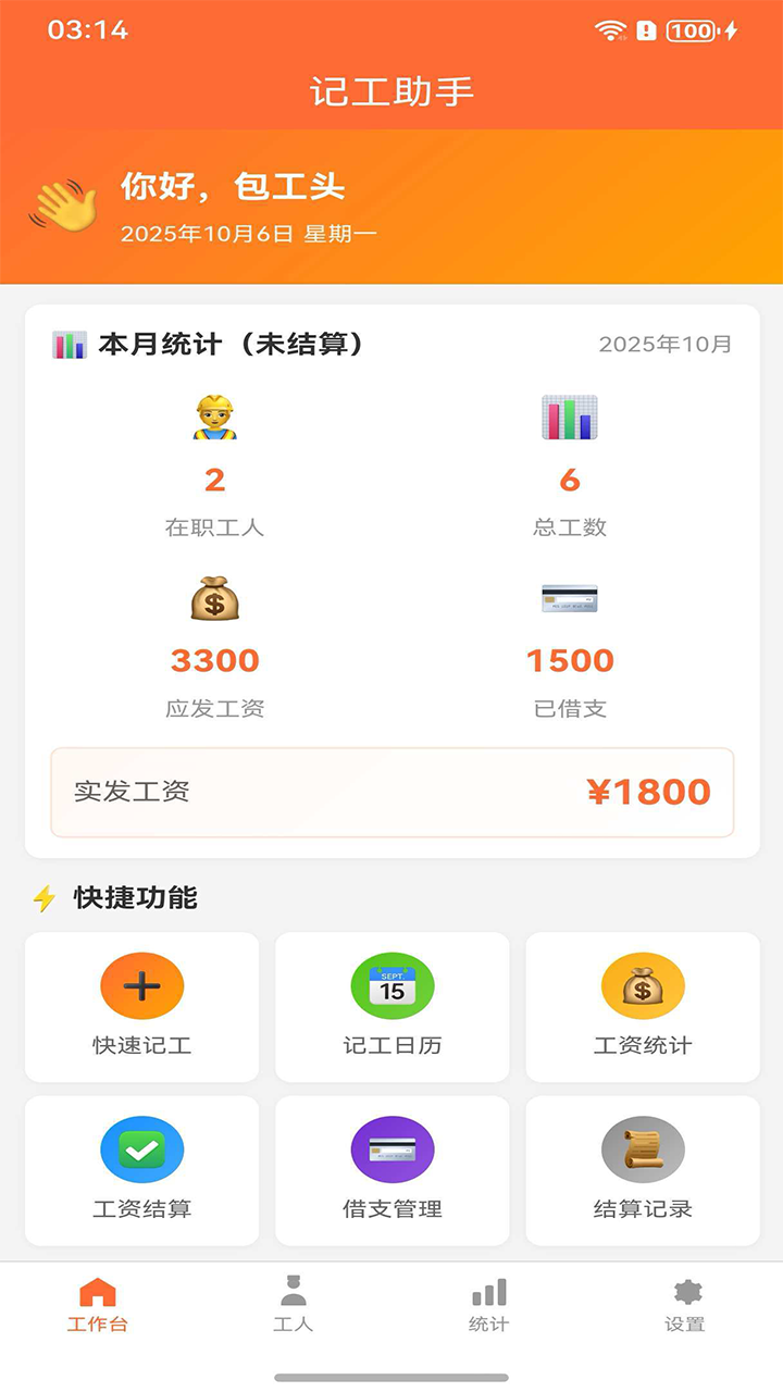 4、点击页面下方的工人,还可以添加工人记工,每次的记录都会安全存储的。