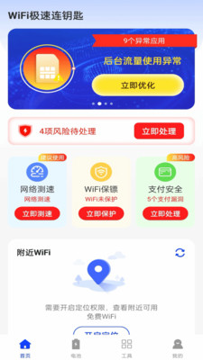 1、在智能手机上下载安装WiFi极速连钥匙app,同意授权必要权限后即刻启用服务。