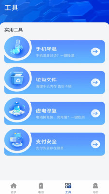 4、工具板块中,提供非常实用的工具,能够进行手机的降温、垃圾文件的清理、虚电的修复、支付隐患的排查。