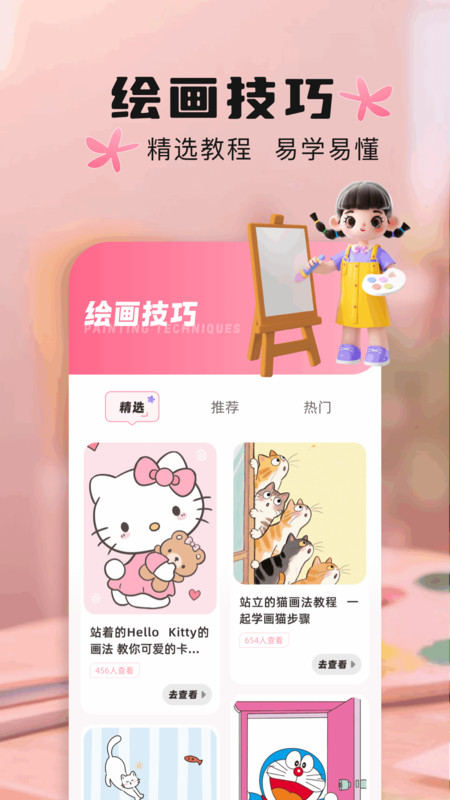 1、在首页,提供精选、推荐和热门的绘画技巧,方便用户轻松绘画各种简笔画。