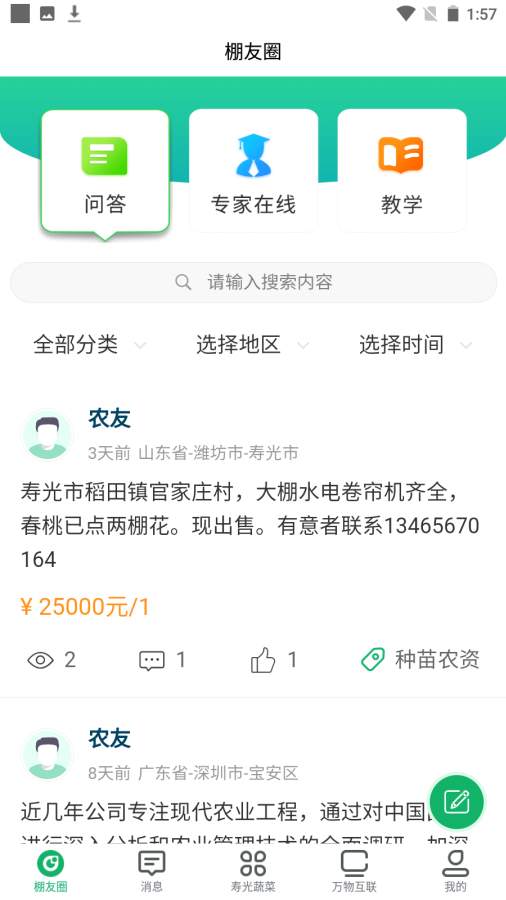 1、进入首页,可以在棚友圈看到用户问答、专家在线等内容。