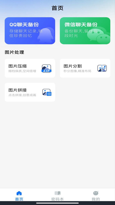 2、进入首页可以看到丰富的功能,可以高效进行微信QQ备份。